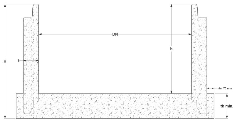 | Varenummer | Beskrivelse | DN (mm) | Høyde H (mm) | Høyde h (mm) | tb min (mm) | Vekt (Kg) | Tykkelse t (mm) | Pris eks. mva |